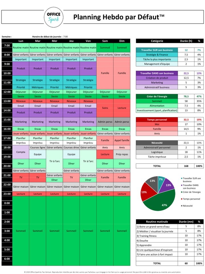Posons-nous simplement les bonnes questions et récoltons des réponses claires, nettes et précises pour mieux avancer ! Quelle portion de mon temps passe dans des choses importantes, dans des choses inutiles ? Comment reprendre le contrôle de mon agenda ? Autant de questions auxquelles le Planning Hebdo par Défaut™ répond avec précision. Afin d'en retirer le maximum, cet outil est accompagné d'une formation pratique.